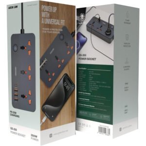 Green Lion GS-200 Power Socket 2500W, Flame Retardant, Overload Protection, 3 Universal Sockets, 3 USB-A Ports, USB-C Port PD 20W – Black