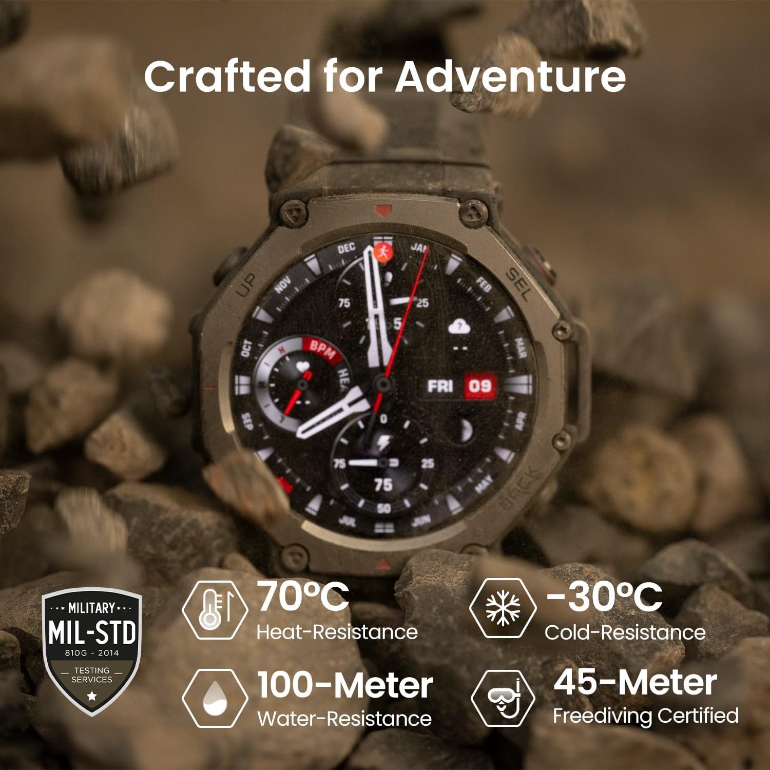 MIL-STD-810H certification withstands -30°C to 70°C extremes and 1.5m drops. BioTracker 5.0 PPG sensor provides 24/7 heart rate, SpO2, and sleep tracking with stress analysis. Acceleration and gyroscope detect falls or paces precisely. Thus, it safeguards health in harsh conditions, from Everest base to coral reefs.