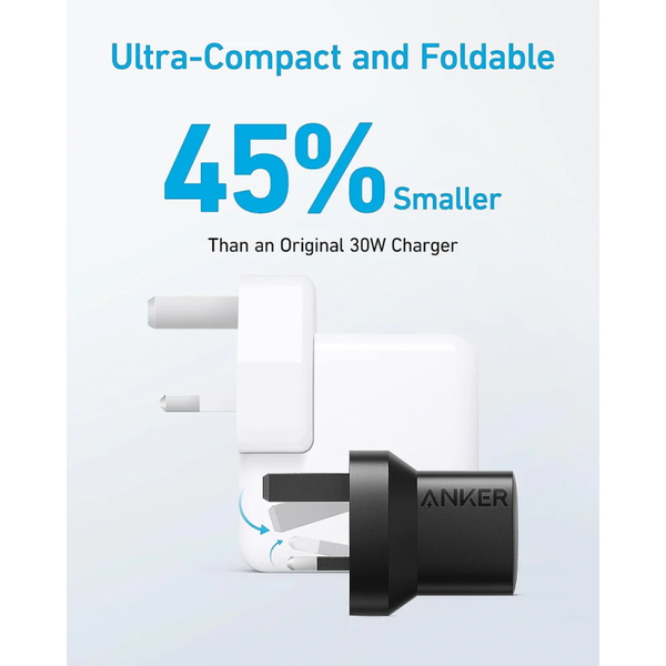 At 45% smaller than a standard 30W charger, it measures just 1.5 x 1.3 x 1.7 inches and weighs 2.1 ounces. Furthermore, the foldable prongs tuck away for bags or pockets. Thus, it’s perfect for home, office, or on-the-go use.