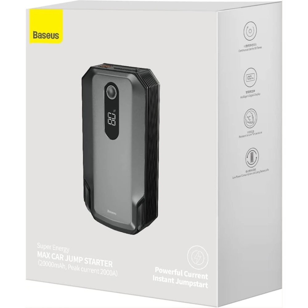 The Baseus Super Energy Max Car Jump Starter in black empowers drivers with instant power and multi-tools for peace of mind. Perfect for unexpected stops, it revives vehicles reliably. Jump start confidently with Baseus quality.