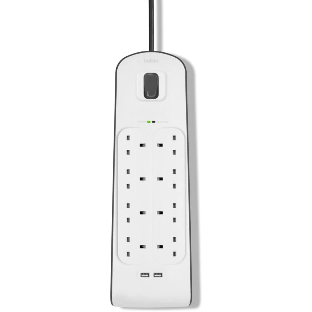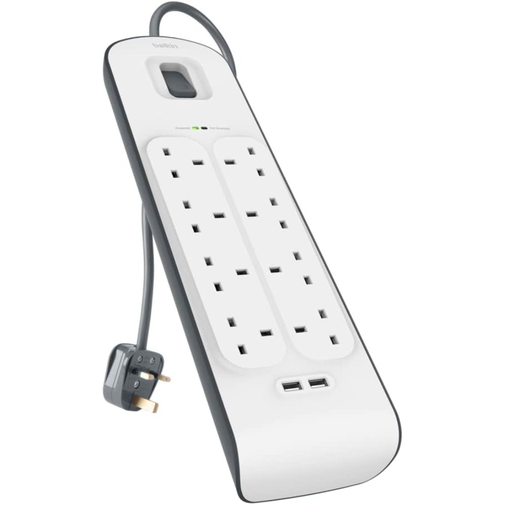The Belkin 8 Way Surge Protection Strip with 2 x 2.4A USB Ports and 2-meter cord provides reliable, high-capacity power distribution and essential protection for home offices, entertainment setups, and everyday electronics. This heavy-duty extension socket features eight protected AC outlets and two integrated USB charging ports (shared 2.4A maximum combined output), allowing you to power and charge up to ten devices simultaneously without needing extra adapters or chargers. Ideal for connecting TVs, computers, gaming consoles, routers, lamps, and mobile devices, it keeps your workspace organized while delivering dependable performance.