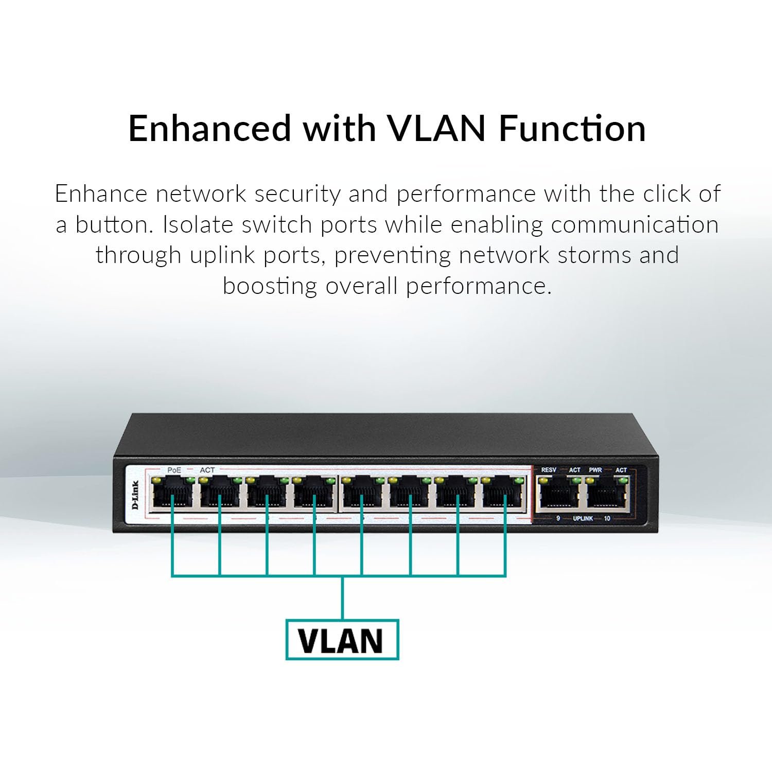 At its core, the D-Link switch offers 10 auto-MDI/MDIX ports: 8 PoE+ 10/100/1000Base-T for data/power and 2 Gigabit uplinks for backbone. For example, long-range PoE extends to 250m, reducing the need for midspan injectors. The 64W budget (802.3af/at) powers 8 ports up to 30W each, perfect for cameras or APs. Furthermore, the 20Gbps switching capacity and 14.88 Mpps forwarding rate handle bursts without drops. As a result, users deploy devices in hard-to-reach areas affordably.