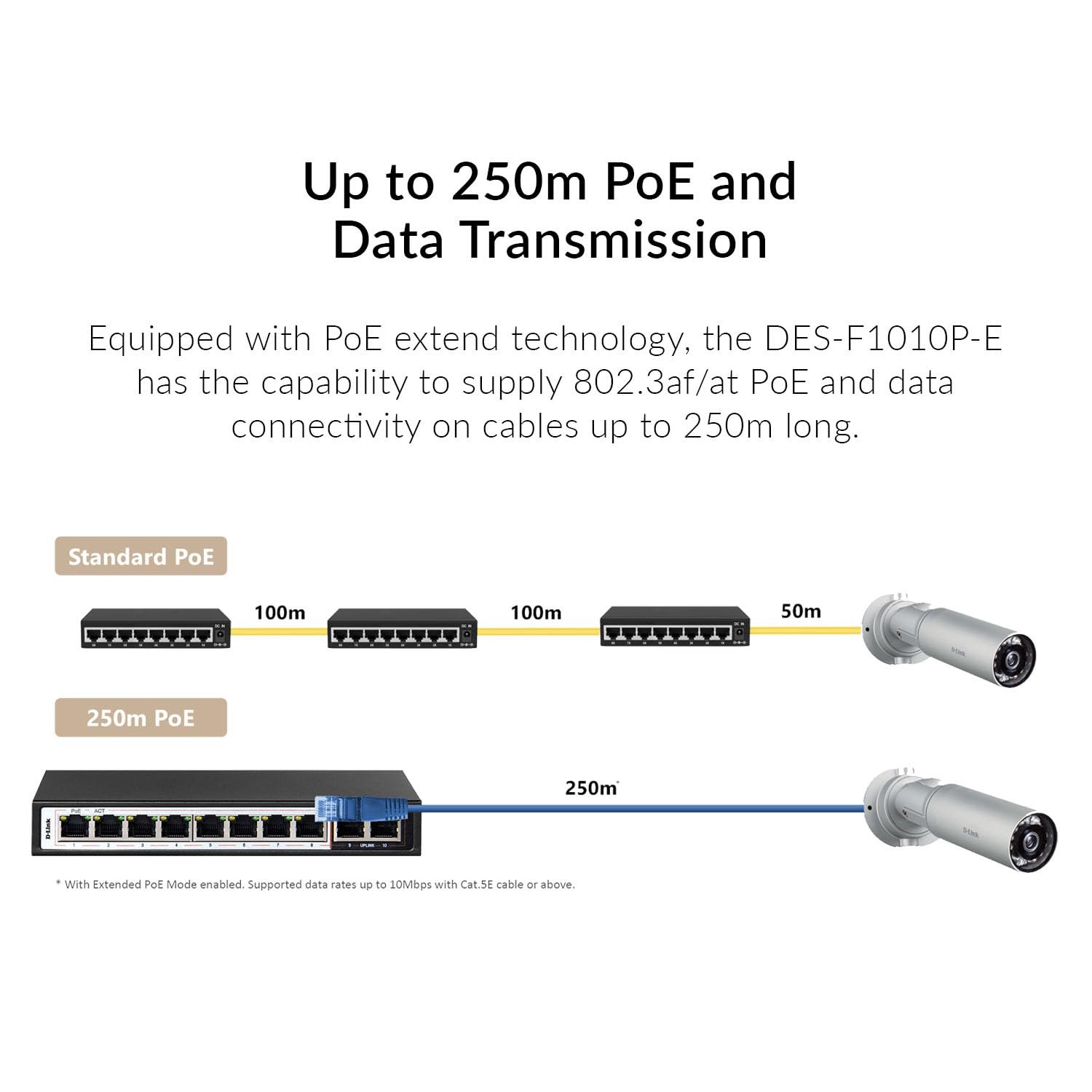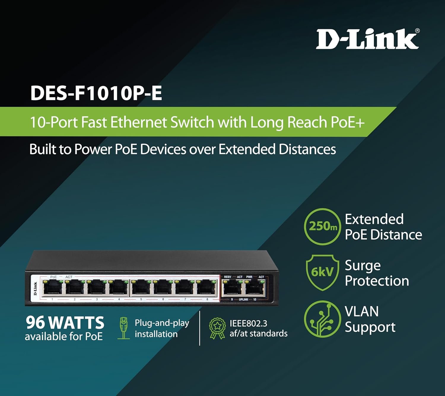 Elevate your small network with the D-Link DGS-F1010P-E. It fuses PoE simplicity, 250m range, and compact design for seamless power and data. Therefore, power up without hassle. Order now for a switch that powers your setup