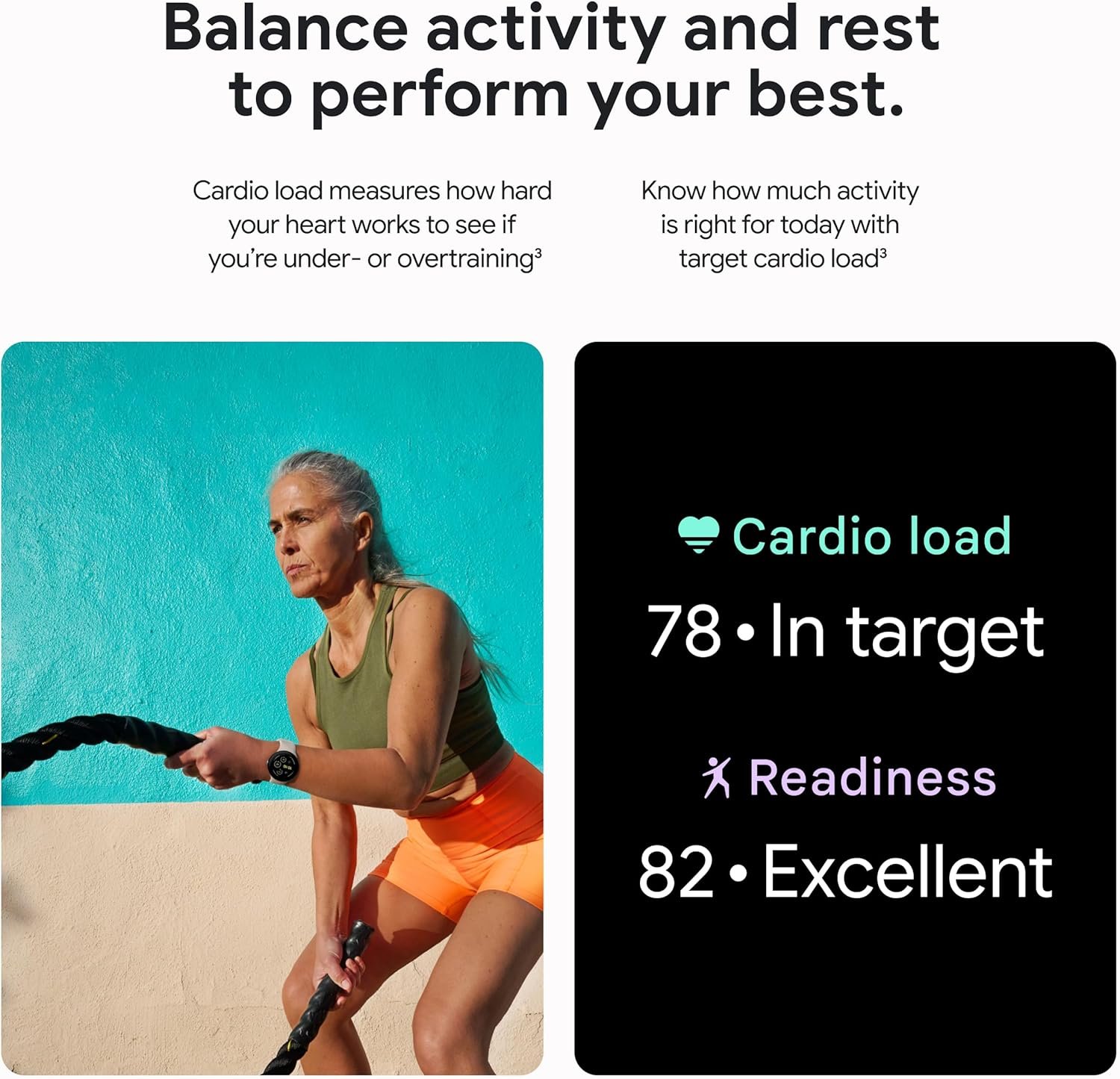 Fitbit integration provides custom run workouts with audio/haptic cues for pace and intervals, plus form tracking. Fitness insights include Readiness Score for recovery, Cardio Load to measure heart exertion, and Target Load for balanced training. Morning Brief summarizes sleep, readiness, and weather.