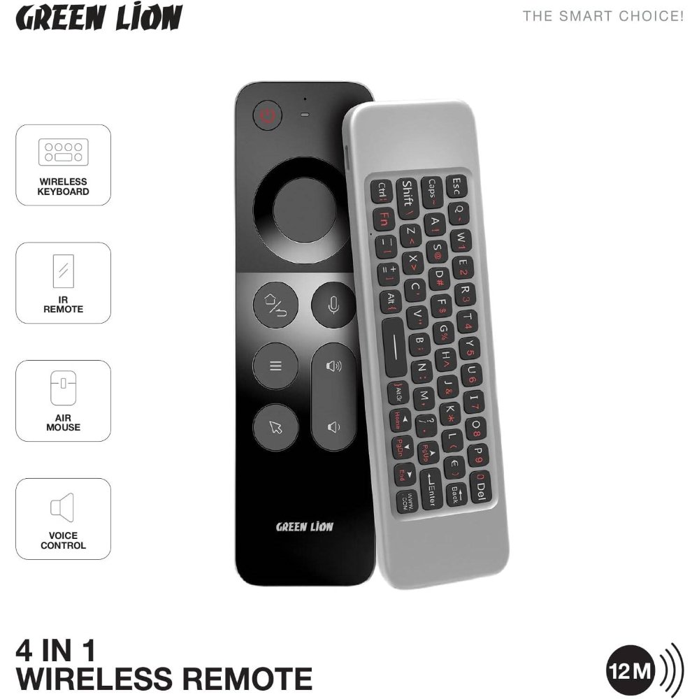 Green Lion 4 in 1 Wireless Remote With Keyboard, Air mouse, Ir remote, Voice control, 250mAh Battery, 20 Days Working Time, 12m Control Range, 58 Keys – Black