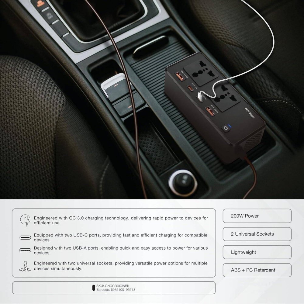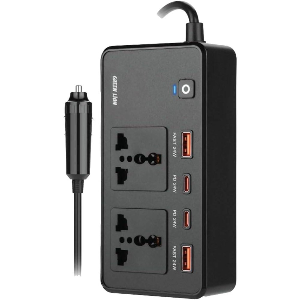The Green Lion GC-200 Car Inverter in black transforms your vehicle into a mobile power hub, ensuring devices stay charged during trips or outages. Its multi-port versatility, safety features, and small footprint make it indispensable for modern drivers. Power your adventures with Green Lion reliability.