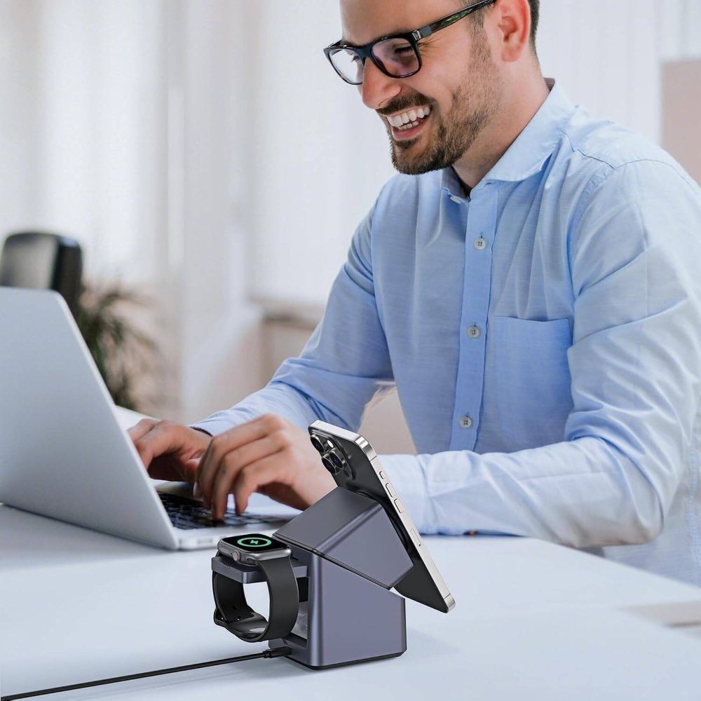 The 15W wireless pad aligns perfectly with MagSafe iPhones for Qi-compatible fast charging up to 15W. For instance, it tops up an iPhone 14 in under 2 hours. Additional ports include USB-C for iWatches/AirPods and USB-A for other devices. Multi-device support powers phones, earbuds, and smartwatches simultaneously. As a result, wake up to fully charged essentials.