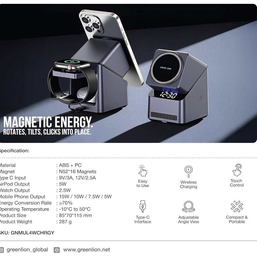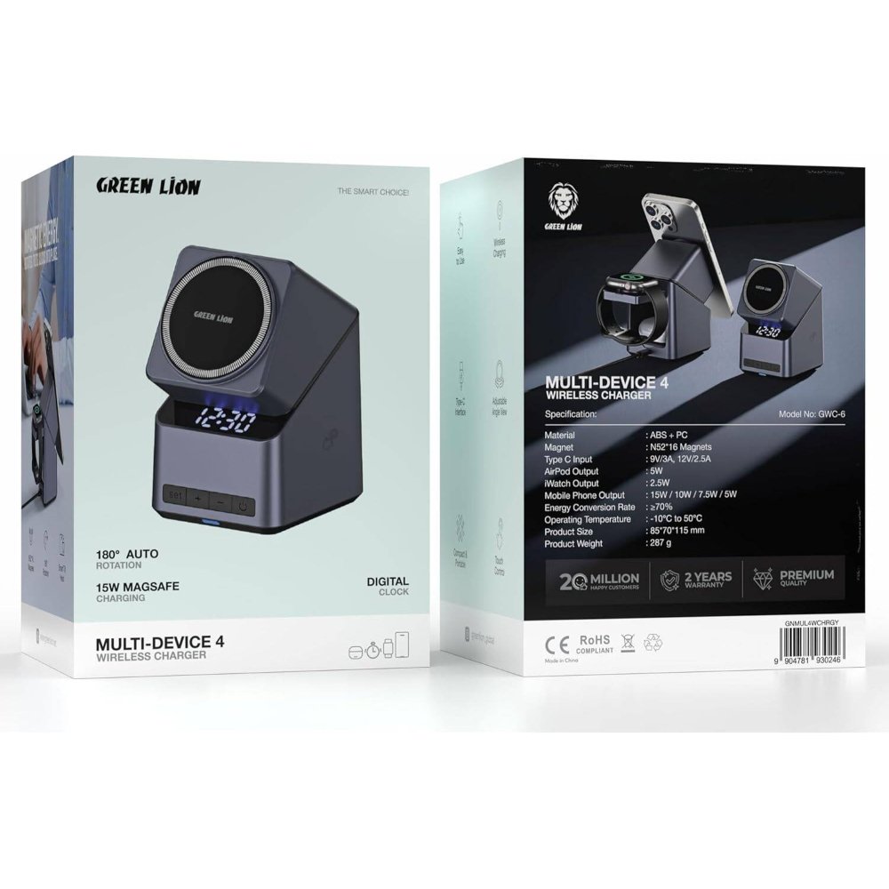 The Green Lion Multi Device 4 Wireless Charger is a sleek, multifunctional charging station in black, combining 15W MagSafe wireless charging with a digital clock for bedside or desk use. Designed to power up to 4 devices at once, it supports iPhones, AirPods, and iWatches with adjustable angle viewing for notifications or alarms. Touch controls allow effortless operation, while the compact 180x100x20mm footprint fits nightstands or offices. With overcharge protection and a sturdy build, this charger ensures safe, efficient power delivery. Ideal for Apple users juggling multiple gadgets, it eliminates cable clutter and keeps devices ready.