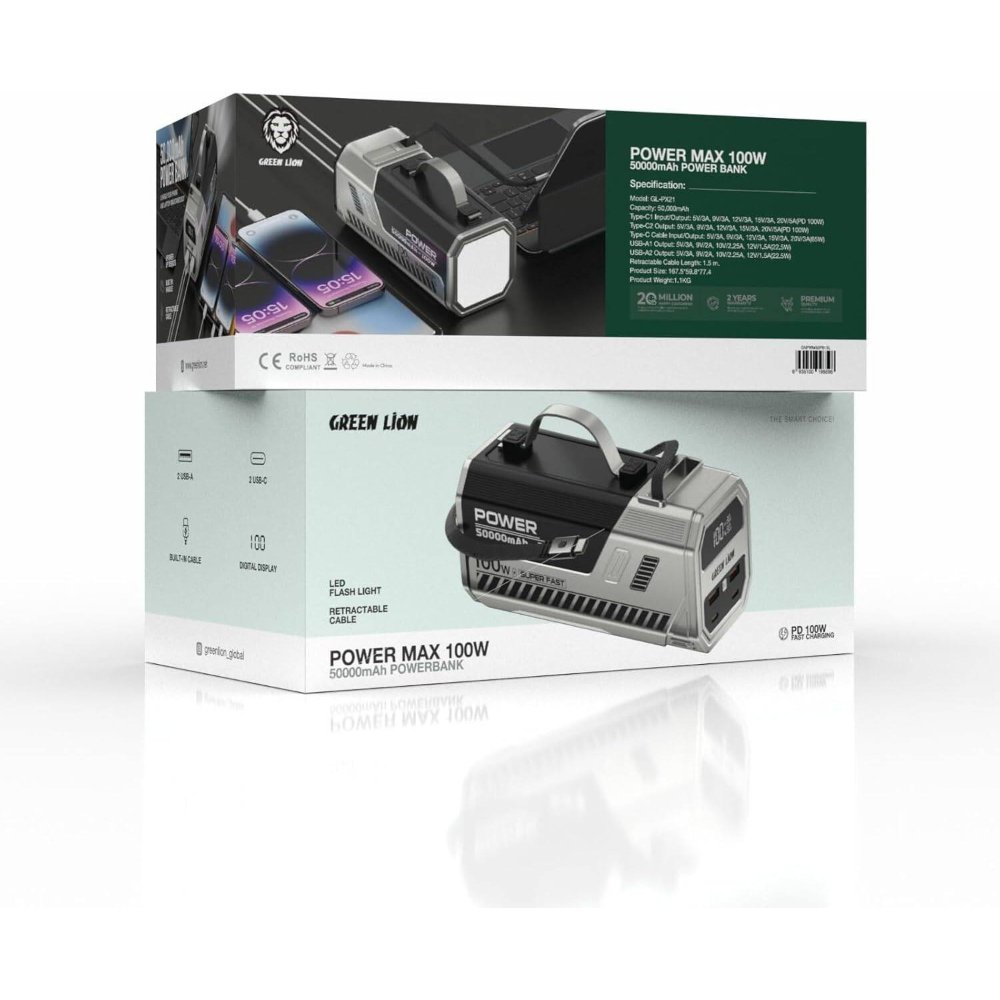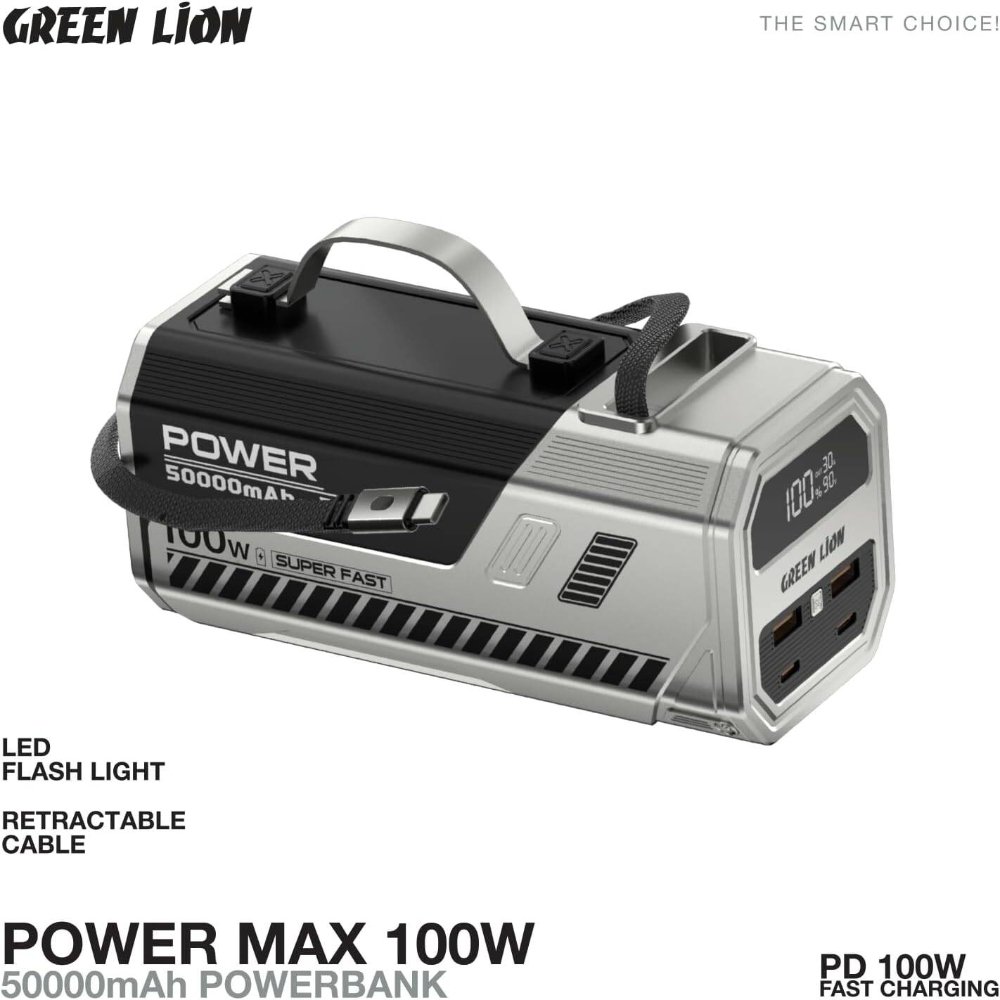 The Green Lion Power Max Power Bank is a rugged, high-capacity portable charger in black, built for extended power needs during emergencies, camping, or daily use. First, its 50,000mAh battery supports 10-15 full smartphone charges or 3-4 tablet sessions, ensuring reliability when outlets are scarce. Additionally, the 100W fast charging via USB-C ports tops up laptops or phones quickly, reaching 50% in about 30 minutes. Therefore, it’s ideal for adventurers or professionals requiring a dependable backup. The high-lumens LED flashlight with SOS mode provides illumination or signaling in dark situations, while the retractable cable stores neatly to avoid tangles. For instance, the digital display shows real-time battery percentage and output voltage for precise monitoring. As a result, this lightweight 600g power bank, measuring 16x8x4cm, fits backpacks comfortably. With multi-device ports (2 USB-C, 2 USB-A) and pass-through charging, it powers several gadgets simultaneously without compromise.