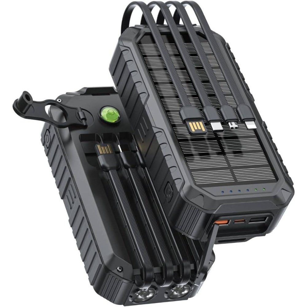The 20000mAh battery powers 4-5 smartphone charges or 1-2 tablet sessions. For instance, the solar panel recharges slowly in sunlight for eco-backup. PD/QC outputs up to 22.5W for fast top-ups. As a result, stay powered off-grid.