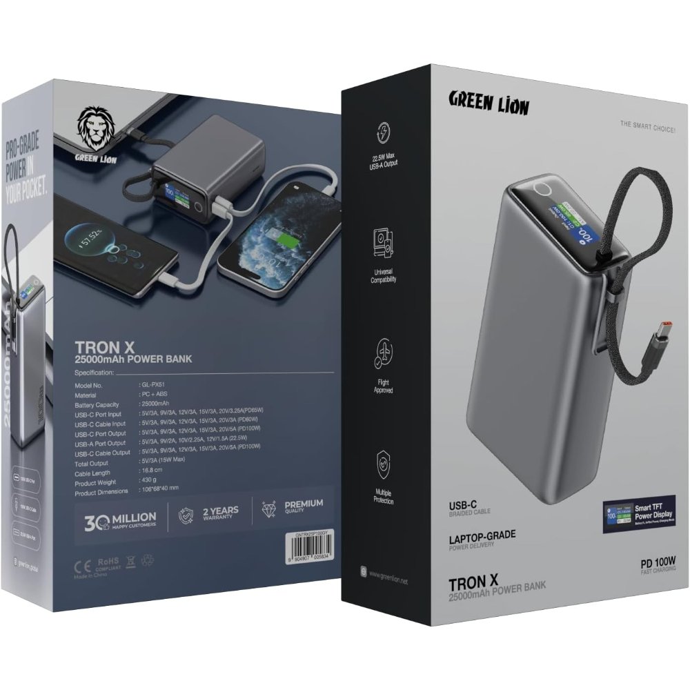 Green Lion Tron X 25000mAh Power Bank, PD 100W, Built-in 100W Braided USB-C Cable, 1×Type-C & 1×USB-A Output Ports, Laptop Charger, Smart TFT Display,