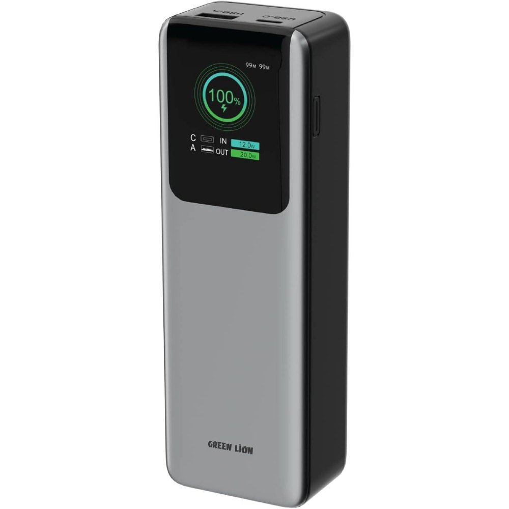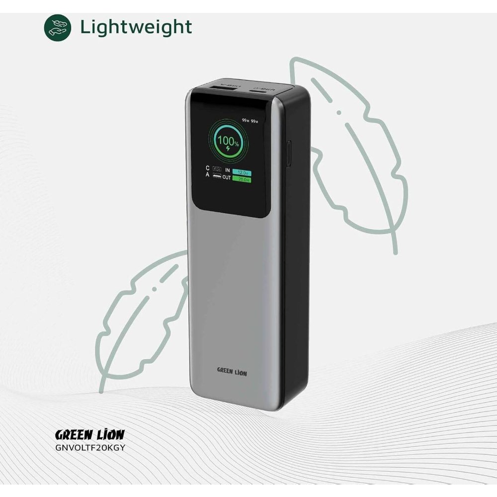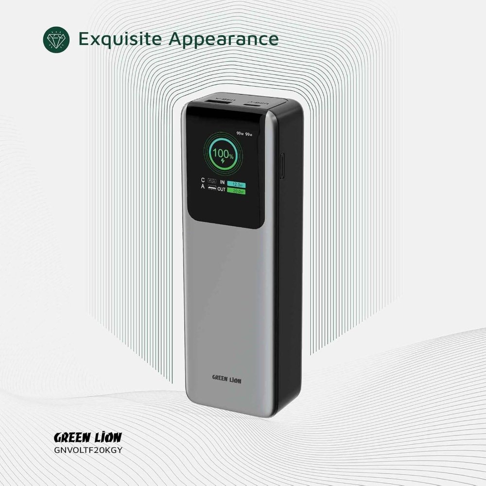 The Green Lion Voltura 20000mAh Power Bank is a sleek, high-capacity portable charger in gray, designed for fast, reliable power on the go. First, its PD 100W USB-C port delivers ultra-fast charging for laptops or phones, reaching 50% in about 30 minutes on compatible devices. Additionally, the TFT display provides a clear, real-time view of battery percentage, voltage, and output status for effortless monitoring. Therefore, it’s ideal for professionals, travelers, or gamers needing dependable backup without bulk. The lightweight 300g design measures 14x7x2.5cm, fitting pockets or bags comfortably. For instance, the QC 22.5W USB-A port adds versatility for older gadgets. As a result, this stylish charger combines power and elegance, with built-in safeguards against overcharge, short-circuit, and overheating. Compatible with iOS, Android, and laptops like MacBook Air, it recharges via USB-C in 3 hours, ensuring minimal downtime.