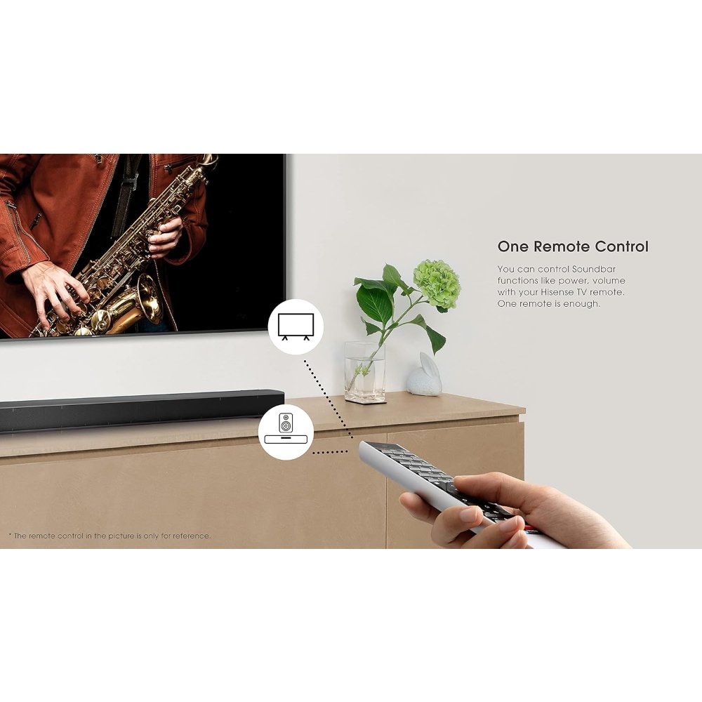 The Hisense HS219 2.1 Channel Soundbar with wireless subwoofer upgrades your TV audio experience with impressive power and clarity in a sleek, space-saving design. Measuring approximately 39 inches wide, the soundbar fits perfectly under most mid-to-large TVs (recommended for 32″ and up), while the dedicated wireless subwoofer adds deep, impactful low-end frequencies that make movies, music, and games feel more immersive. With a total output of 320W (60W x 2 for the soundbar channels plus 200W from the subwoofer), this system delivers room-filling sound that transforms flat TV speakers into a cinematic experience.