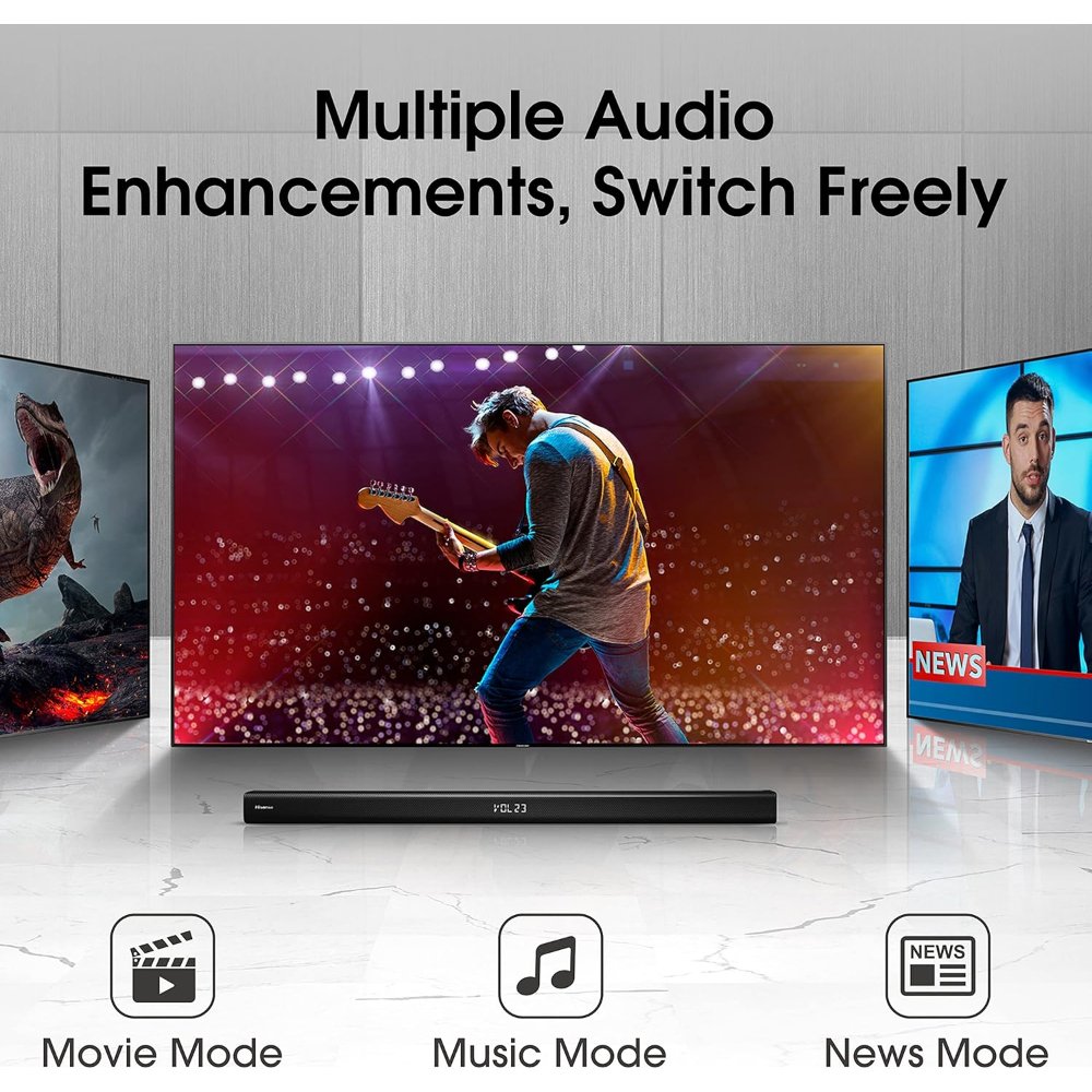 The soundbar includes four front-firing speakers paired with a dedicated wireless subwoofer for powerful low-end bass without tangled cables. Dolby Digital audio support creates a more dynamic, surround-like experience with enhanced clarity and depth. Three EQ modes—Music for balanced playback, Movie for cinematic effects, and News for crisp vocals—let you tailor the sound to your content instantly.