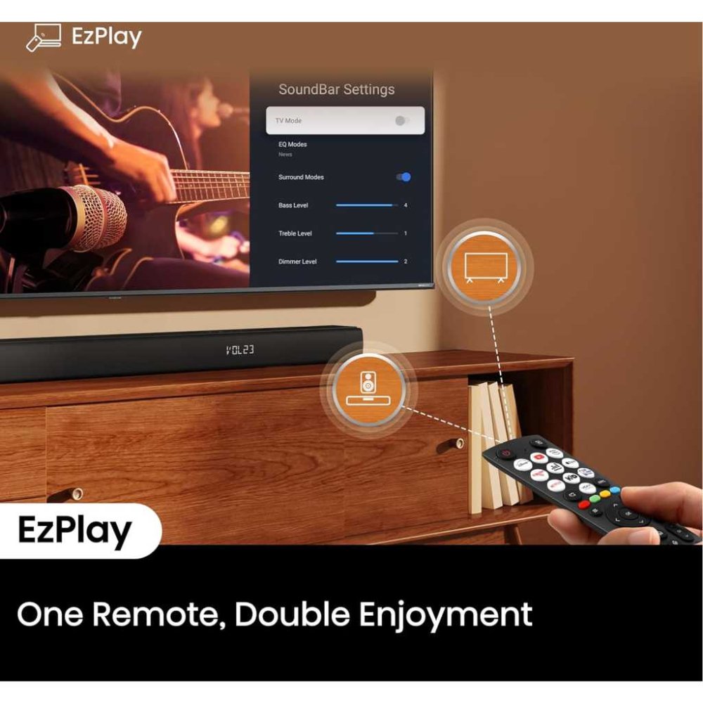 The wireless 6.5″ subwoofer connects effortlessly without cables, allowing flexible placement for optimal bass response. It handles deep, rumbling lows for explosions, bass-heavy music, and intense game effects without distortion, even at high volumes. Complementing this are 6 tailored sound modes (Movie, Music, News, Night, Sport, Game), letting you optimize audio with one remote press. TV Mode (via EzPlay) enhances compatibility with Hisense TVs, potentially passing through advanced formats like Dolby Atmos when supported by the TV, while EzPlay simplifies setup and control using your TV remote.
