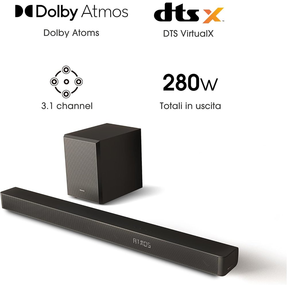 Hisense Soundbar AX3100G with 280W, 5 speakers and 6.5 subwoofer, Dolby Atmos, DTS Virtual X, Bluetooth 5.0, EZ Play