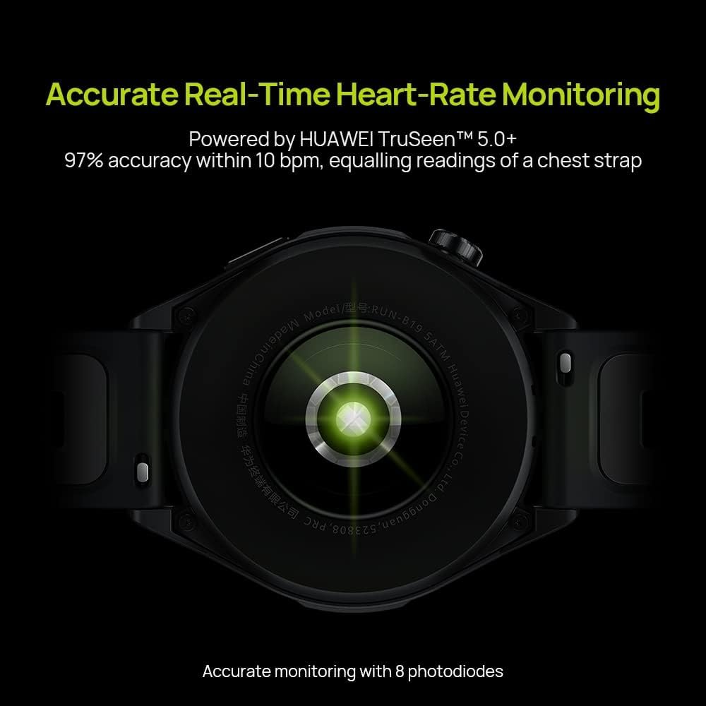 Health monitoring is powered by HUAWEI TruSeen™ 5.0+ optical sensors for accurate real-time heart rate tracking (with external chest strap pairing support), blood oxygen (SpO2), stress levels, sleep analysis, and overall PAI score. It tracks over 100 workout modes, with detailed metrics for running, cycling, swimming, and more.