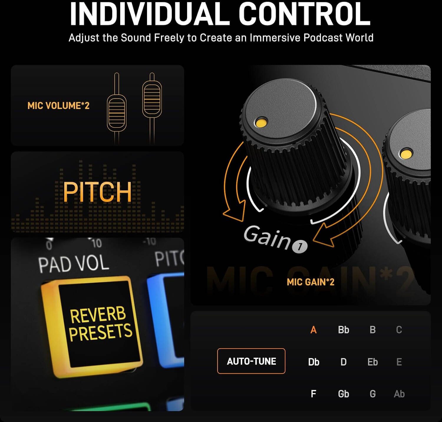 • 11 Sound Pads: App-customizable effects.