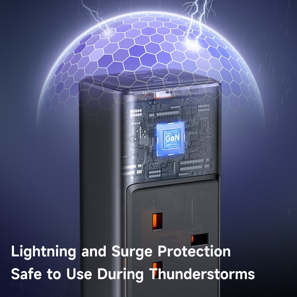 GaN technology shrinks the unit 40% smaller than standard strips, staying cool under 45°C during use. Built-in surge prevention absorbs spikes up to 600J, with safeguards against overcurrent or overheating. Furthermore, the fireproof ABS shell and child-safe outlets add family security. Thus, it’s safer for kids’ rooms or workspaces.
