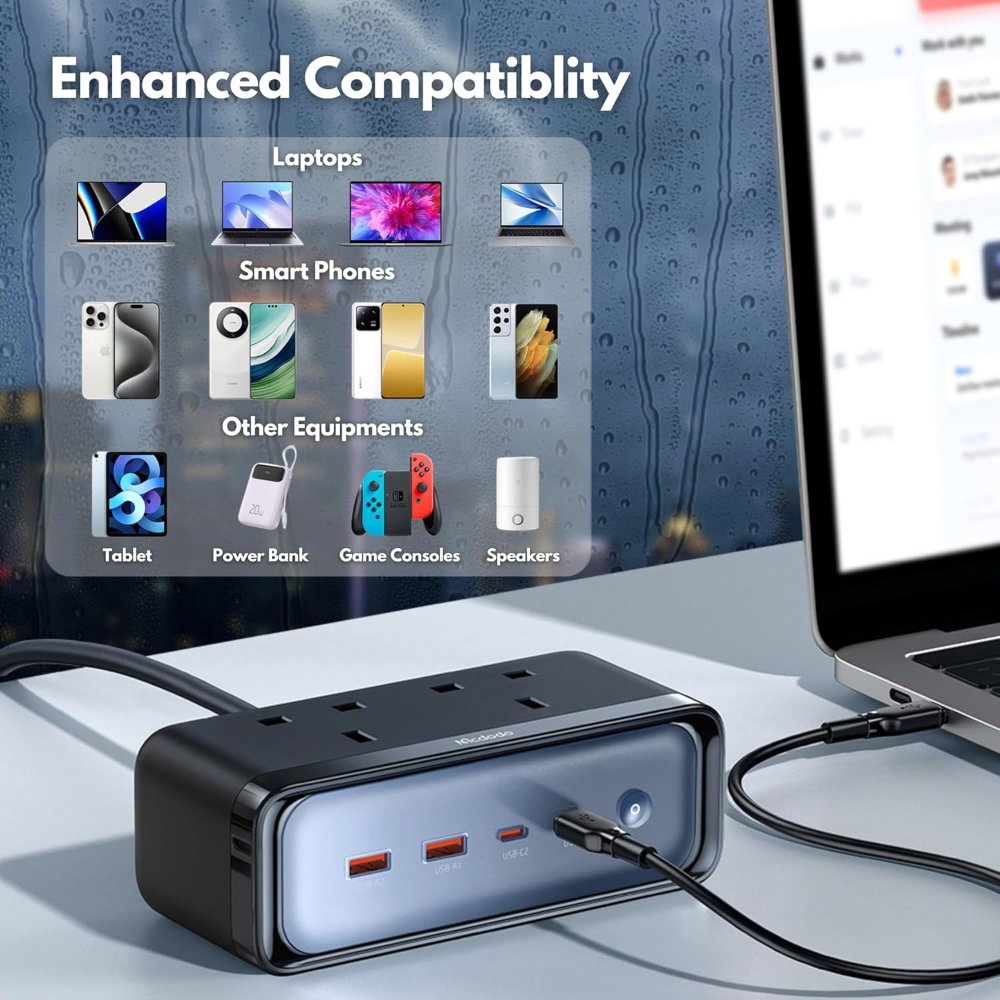 In a multi-device era, chargers must be safe, fast, and compact. Therefore, the Mcdodo CH-459 6-in-1 70W GaN Surge Protection Power Strip, a dynamic GaN surge protection strip, safeguards your gear while delivering robust output. This UK-plug adapter includes 2 USB-C PD, 2 USB-A QC, and 2 AC outlets for up to 6 devices. Moreover, its surge protection and 1.5m cord make it ideal for desks, travel, or home offices.