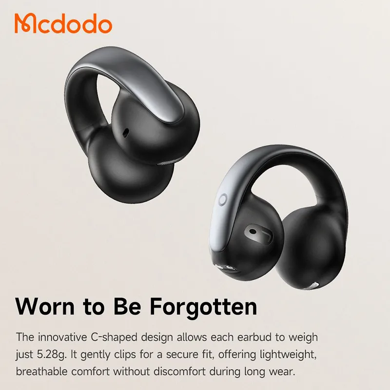 The Mcdodo HP 8160 Air O3 clip-on open ear earbuds keep you connected to music and the world around you. First, the lightweight 4.5g buds clip comfortably over your ears without entering the canal. So, you enjoy podcasts during runs while hearing traffic or conversations. Moreover, the ergonomic hook design stays secure during workouts or commutes. As a result, no more ear fatigue from in-ear seals.