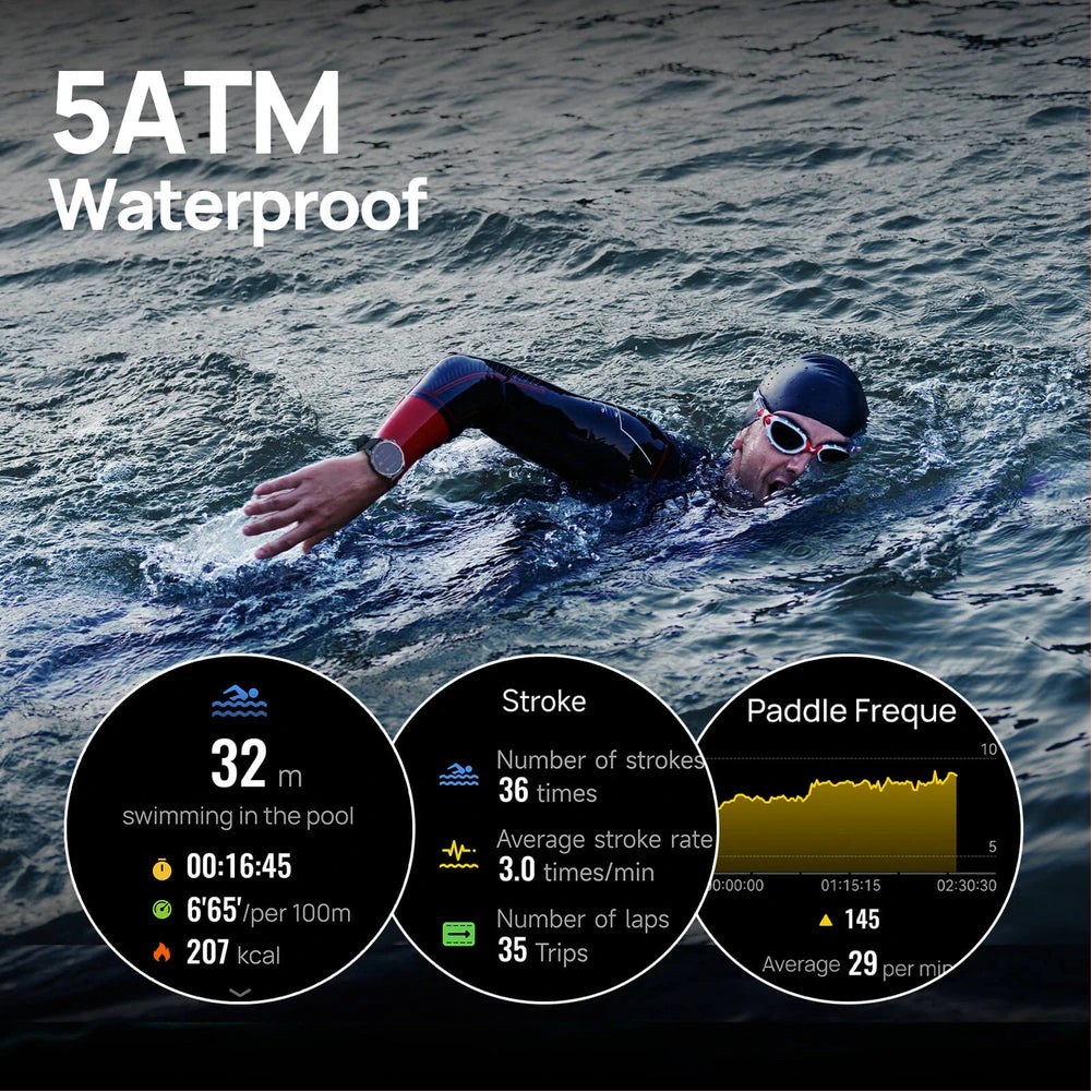 The 1.43″ AMOLED screen provides 466×466 resolution with 60Hz refresh for fluid, glare-free viewing. For example, glance at texts or maps mid-run without missing a beat. Consequently, it enhances user engagement. Additionally, Bluetooth 5.3 enables HD calling with noise-canceling mic, allowing hands-free chats up to 10 meters away.