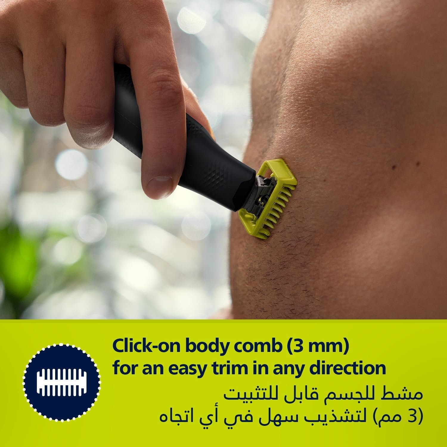 Click on the adjustable comb and choose any length from 0.4 mm (designer stubble) to 10 mm (short beard) in 14 precise steps. The extra body comb + click-on skin guard let you comfortably trim chest, back, or below-the-belt areas.