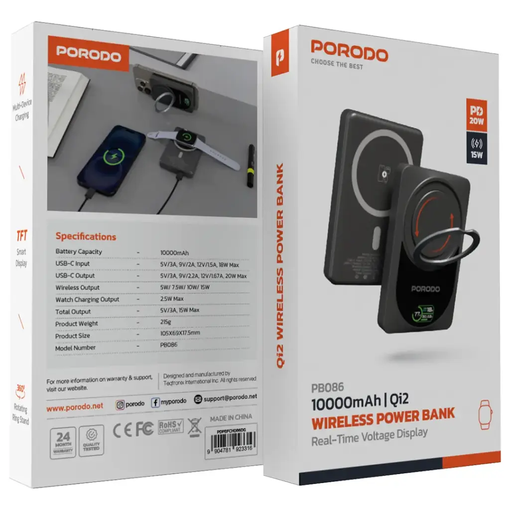 The Porodo 10000mAh Qi2 Wireless Power Bank in dark gray merges cutting-edge Qi2 tech with practical power. With magnetic ease, fast charging, and smart monitoring, it’s ideal for on-the-go users. Therefore, secure yours today and power through without interruptions.