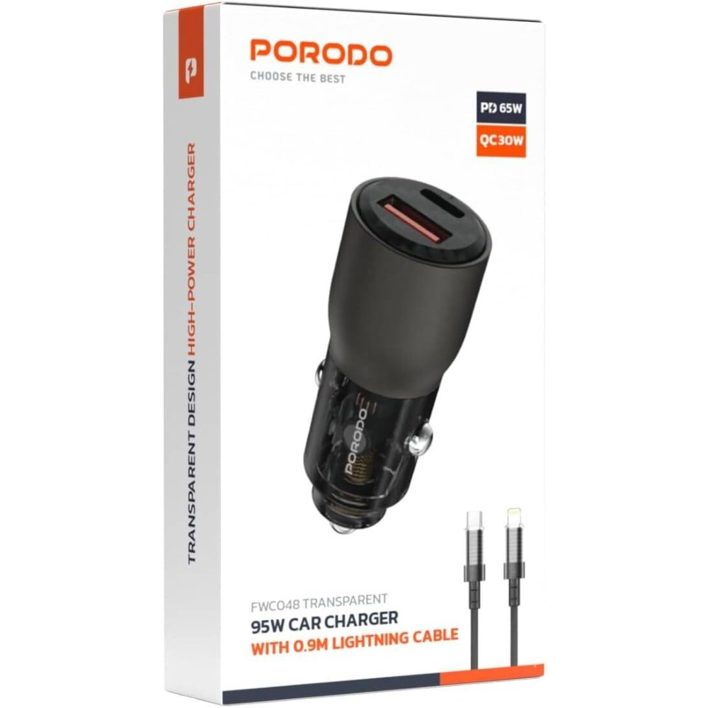 In today’s mobile lifestyle, car chargers must provide fast, reliable power for multiple devices without compromising safety. Consequently, the Porodo 95W Car Charger, a premium transparent zinc alloy car charger, excels with its 95W total output, supporting PD 65W on USB-C and QC 30W on USB-A. This adapter charges smartphones, tablets, and laptops simultaneously, perfect for road trips or daily commutes. For example, it boosts an iPhone 15 to 60% in 30 minutes or a MacBook Air at full 65W. Moreover, its 12-24V input ensures compatibility with cars and trucks. Therefore, the Porodo 95W isn’t just a charger—it’s a versatile power solution for tech-savvy drivers.