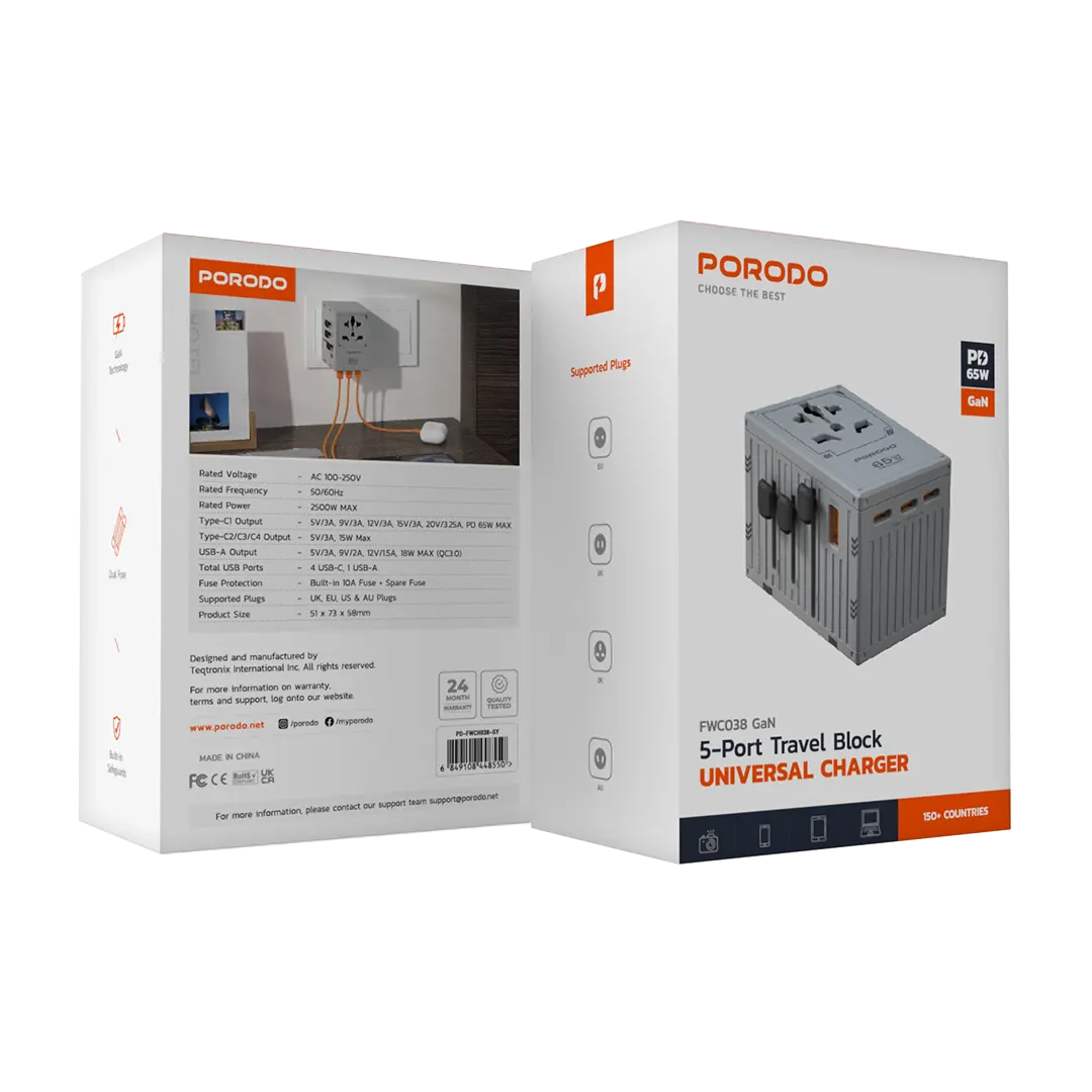 In summary, the Porodo GaN 5-Port Travel Block Universal Charger redefines on-the-go charging with speed, safety, and simplicity. It’s indispensable for explorers craving connectivity. Therefore, pack it today and stay powered across borders. Your adventures deserve unstoppable energy.