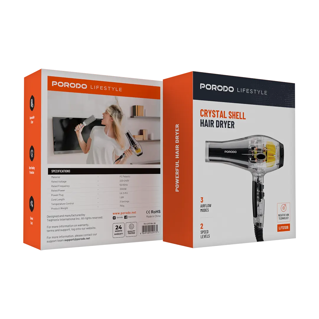 In conclusion, the Porodo Lifestyle Crystal Shell Hair Dryer offers the perfect combination of style, technology, and performance. With its sleek crystal shell, adjustable settings, and powerful motor, it ensures fast, smooth, and salon-level results right at home. Therefore, whether you’re styling for work, an event, or a casual day out, this hair dryer guarantees flawless results with every use.