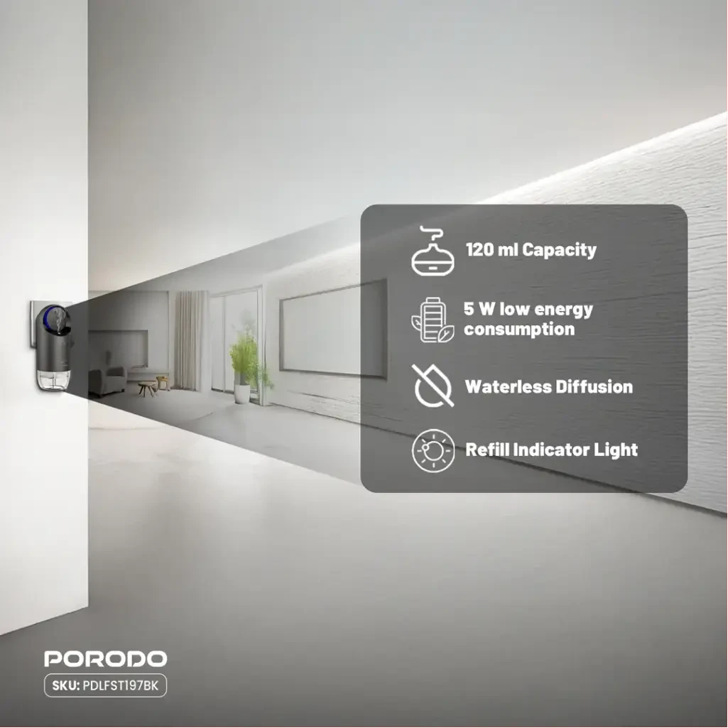 Elevate your daily routine with the Porodo Lifestyle Wall Plug-In Essential Oil Diffuser. It fuses simple plug-in design, adjustable diffusion, and safe materials for soothing aromas. Therefore, create calm moments today. Order now for a diffuser that scents your life.