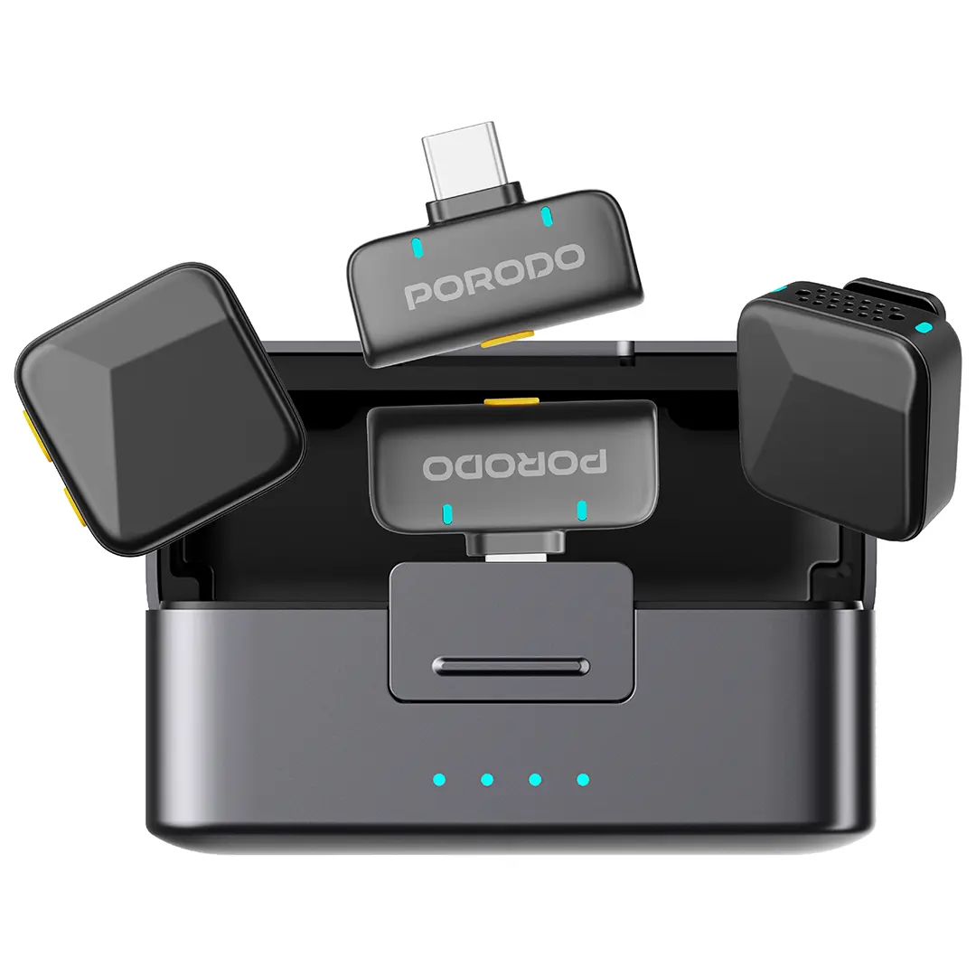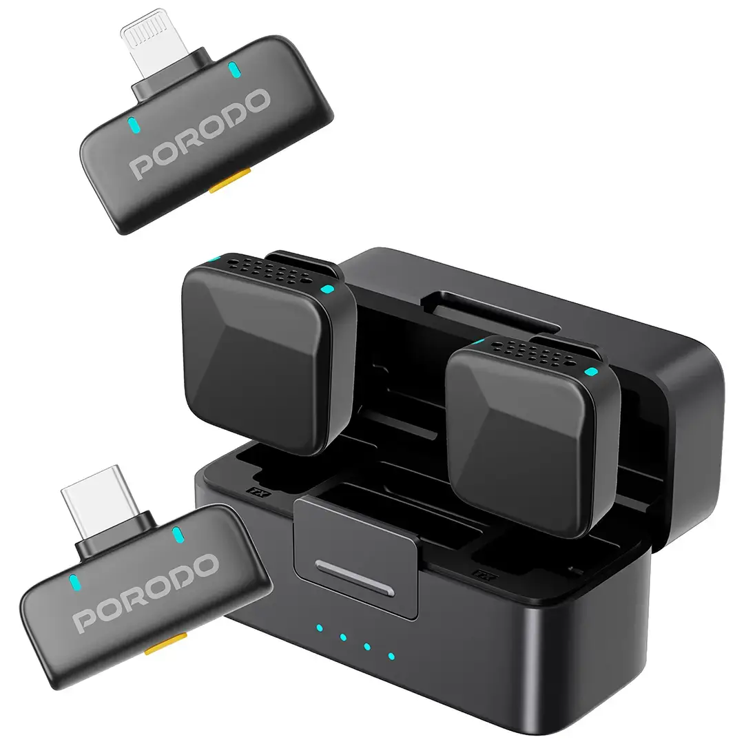 The Porodo Orion Lavalier Microphone Type-C & Lightning empowers creators with wireless freedom. Moreover, its dual-mic system excels in vlogs and interviews. First, clip-on lavaliers deliver omnidirectional pickup. Thus, voices sound natural and full. Additionally, the compact receiver fits any setup seamlessly. For instance, podcasters praise its reliability daily.