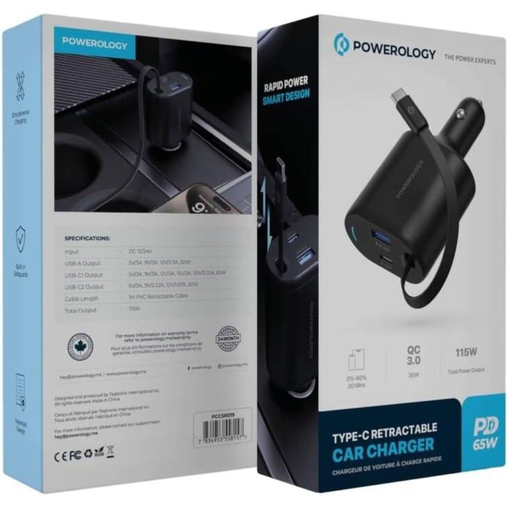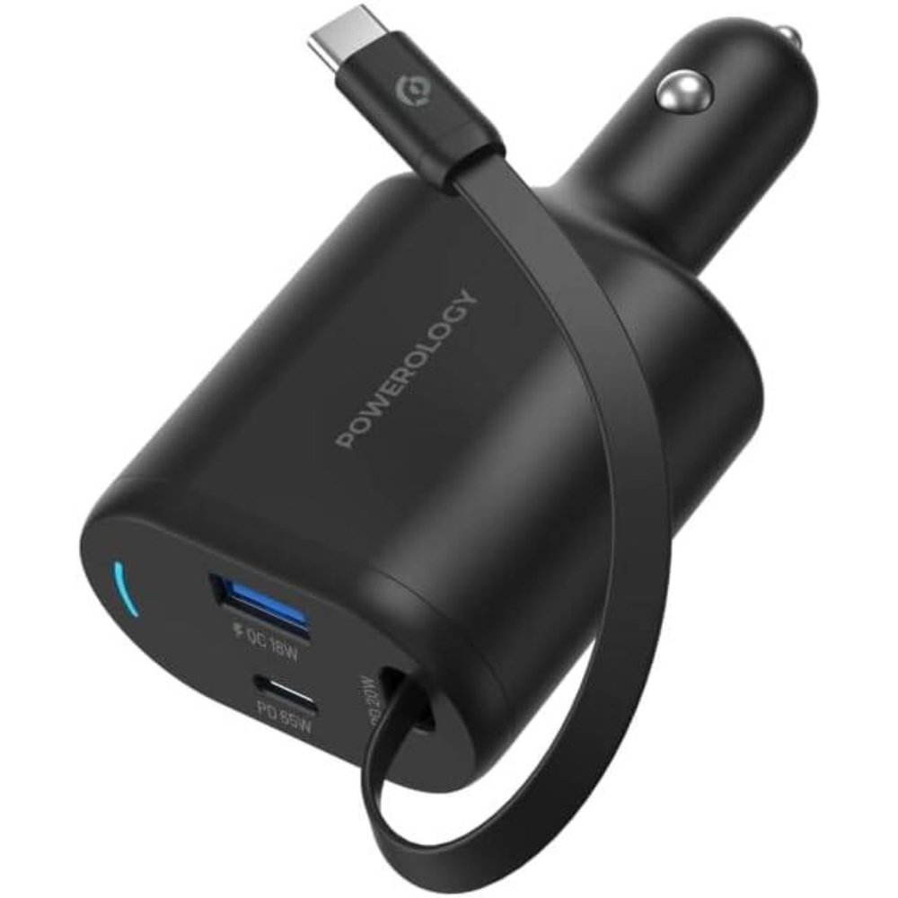 The Powerology Dual Ports Car Charger in black streamlines road power with its fast ports and retractable design. Ideal for busy drivers, it keeps laptops and phones charged reliably. Drive powered with Powerology quality.
