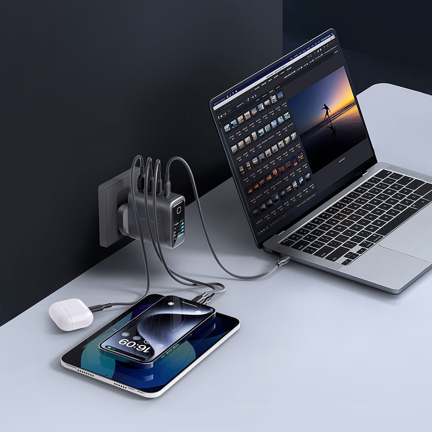 The three-port setup (2 USB-C, 1 USB-A) handles multiple devices, with dynamic allocation—e.g., 100W + 20W + 18W. Universal AC input works globally with the foldable prongs. No apps needed—plug and charge. So, connect effortlessly.