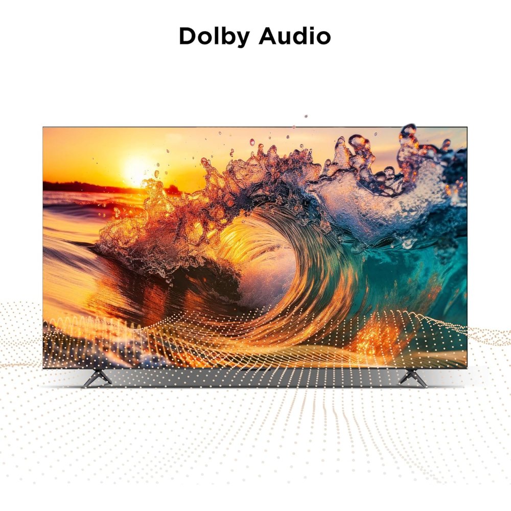 Dolby Audio delivers clear, room-filling sound through built-in speakers. Smart volume leveling prevents jarring shifts between content. The slim, metallic bezel-less design adds elegance while saving space. Connectivity includes HDMI, USB, Wi-Fi, and Bluetooth for effortless device pairing.