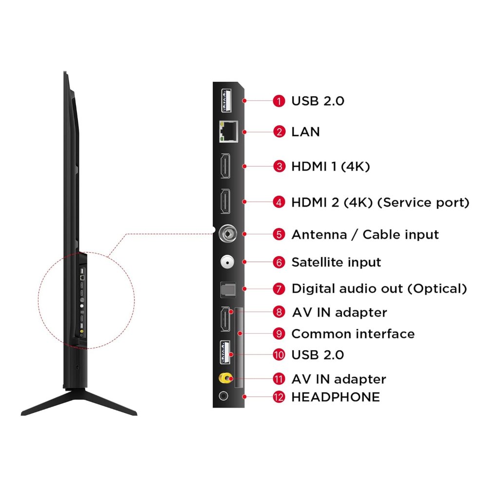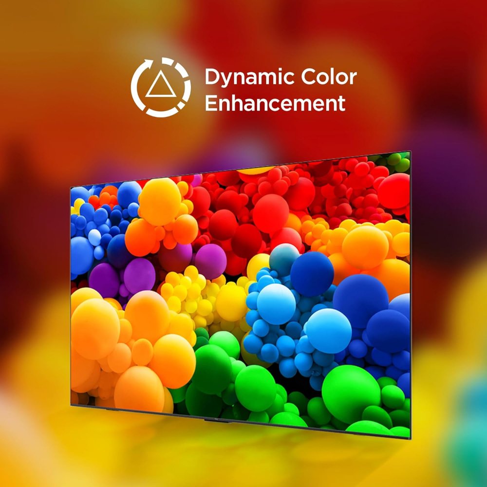 Dolby Audio delivers clear stereo sound with balanced output and smart volume adjustments. The metallic bezel-less design creates a premium, immersive aesthetic while keeping the TV sleek. Connectivity includes 3x HDMI ports (with HDMI 2.1 compatibility), 2x USB, dual-band Wi-Fi (2.4GHz/5GHz), Bluetooth, and more for effortless setup with gaming consoles, soundbars, or streaming devices.